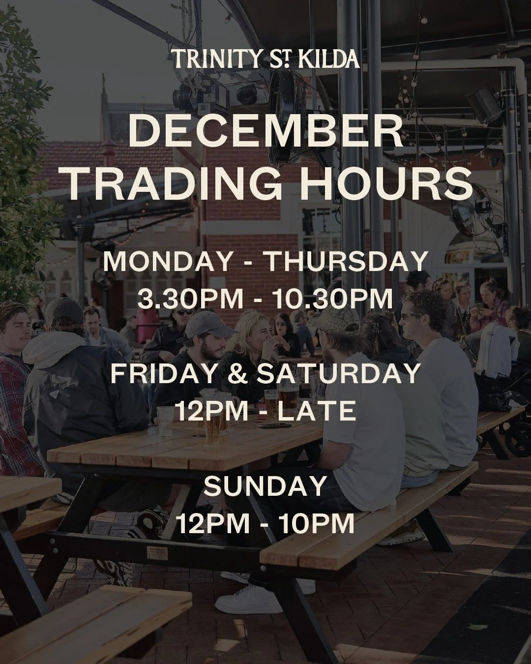 BEER HALL • beer garden • FUNCTIONS Sign Up Leave us your details to stay updated with what’s on at Trinity St. Kilda. First Name Last Name Email Address Sign Up Thank you for signing up for updates from Trinity St Kilda. View fullsize View fullsize View fullsize View fullsize Trinity St Kilda Bar - Food Trucks, Beer Garden, Events, Good Times